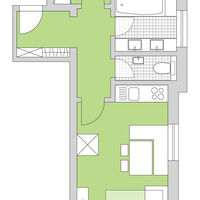 All apartment types consist of a dining area, a kitchenette, at least one bedroom, a bathroom, a toilet, a large lobby with a wardrobe and a southwest-facing balcony. Depending on the type of apartment, these may have up to 2 bedrooms and a combination bed-sitting room.