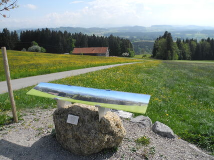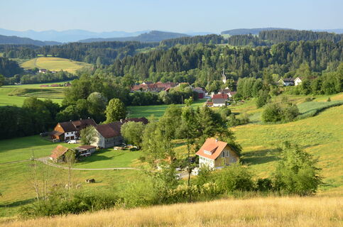 Nach einer Stärkung laufen wir die Straße entlang Richtung Gestratz und folgen nach ein paar hundert Metern links dem Wegweiser Richtung Altenburg. Wir überqueren die Bundesstraße und laufen über die Wiese den Weg entlang am Hang hinab zurück nach Gestratz.