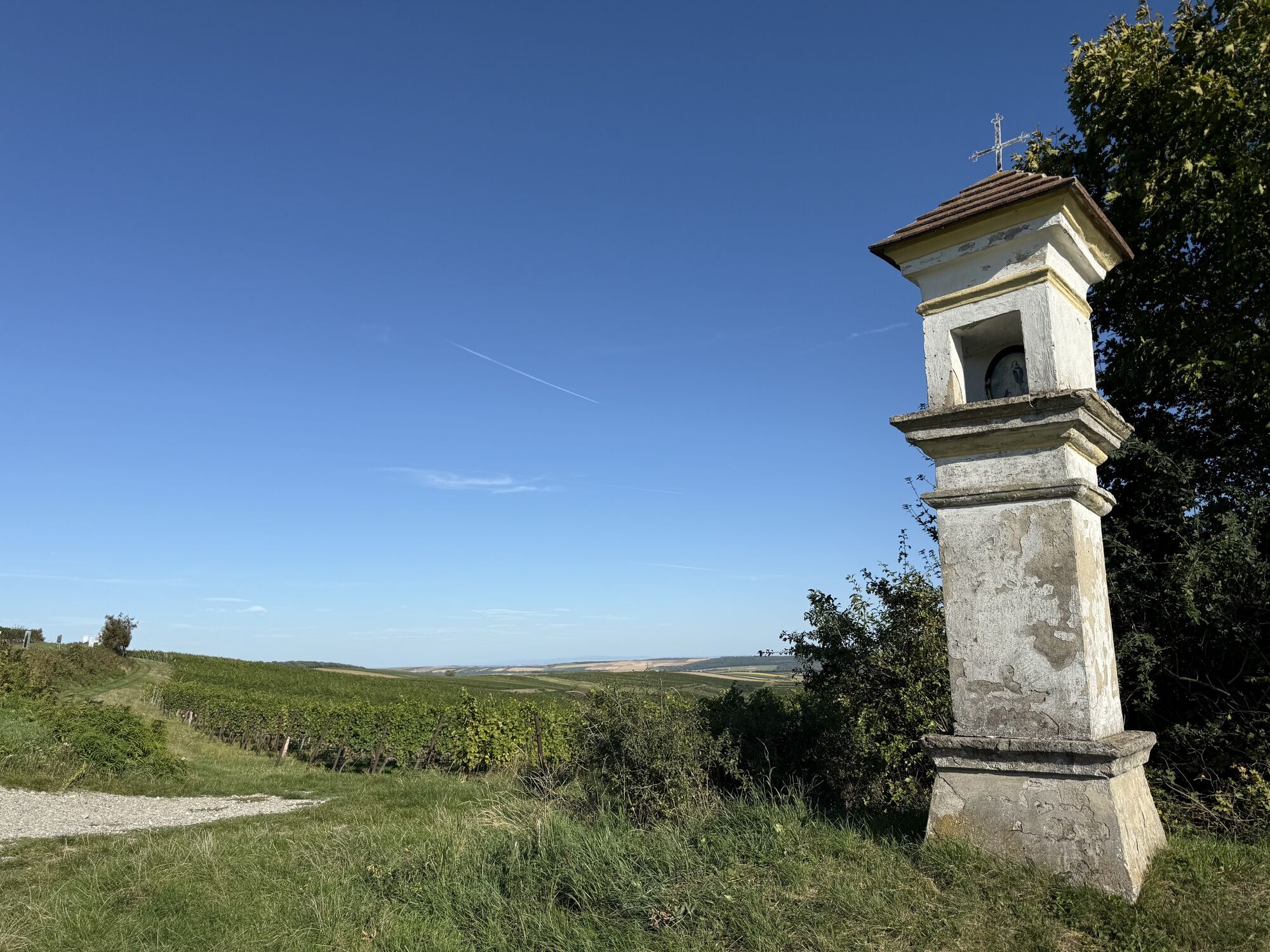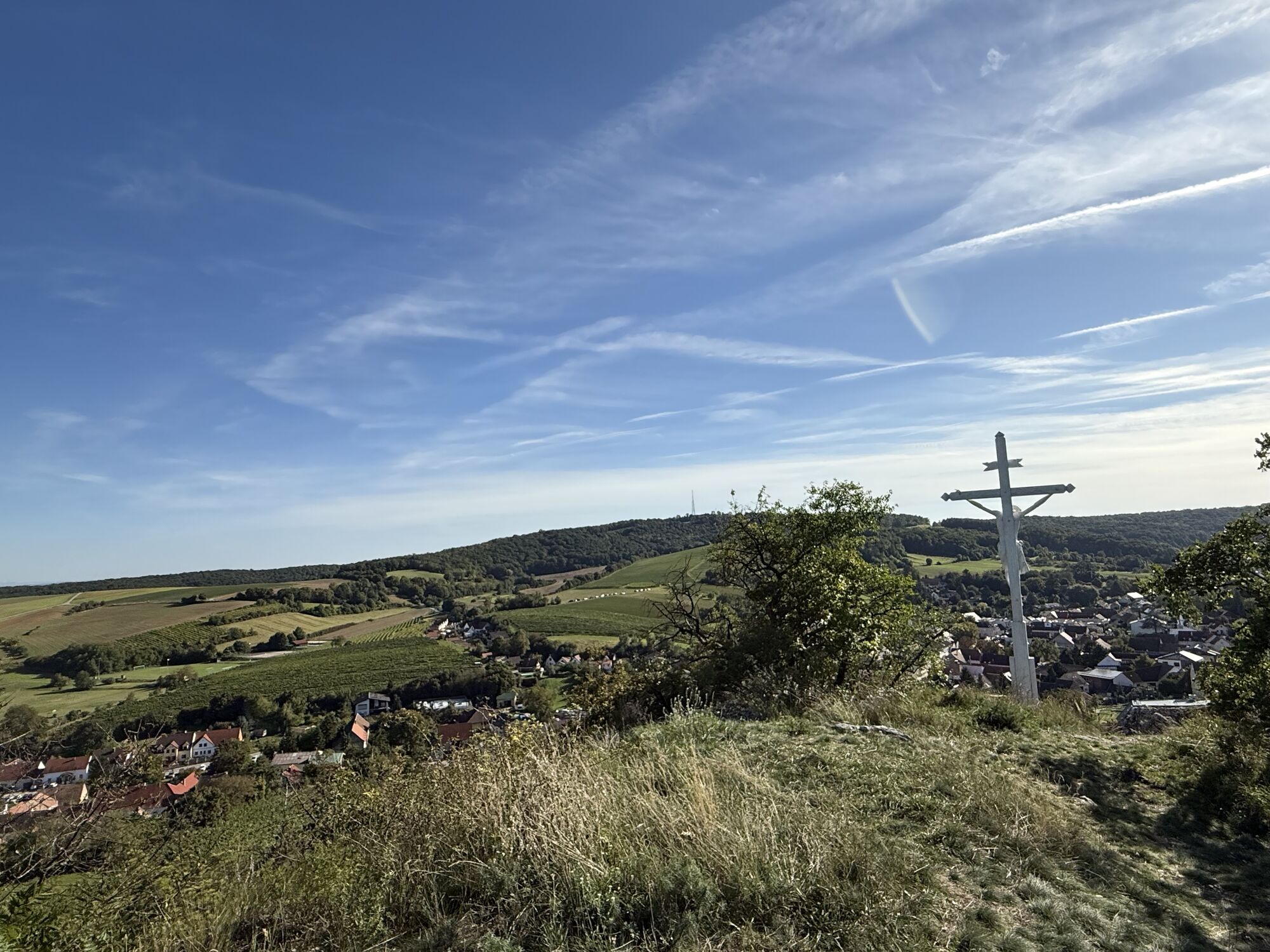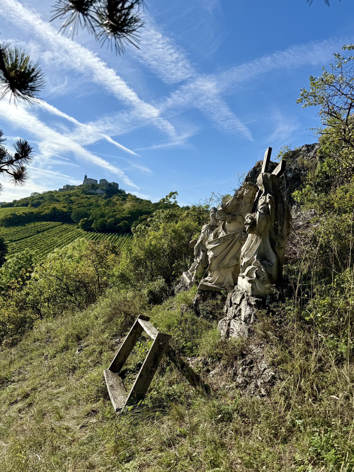 Vorbei an der Kirche hoch zur Ruine wieder runter zur Höllen(Höhlen)steinhöhle unterhalb vom Sender. Vorbei an der Reblaus hoch zum Materl, über den Kreuzweg wieder hinab nach Falkenstein und am Schluss...