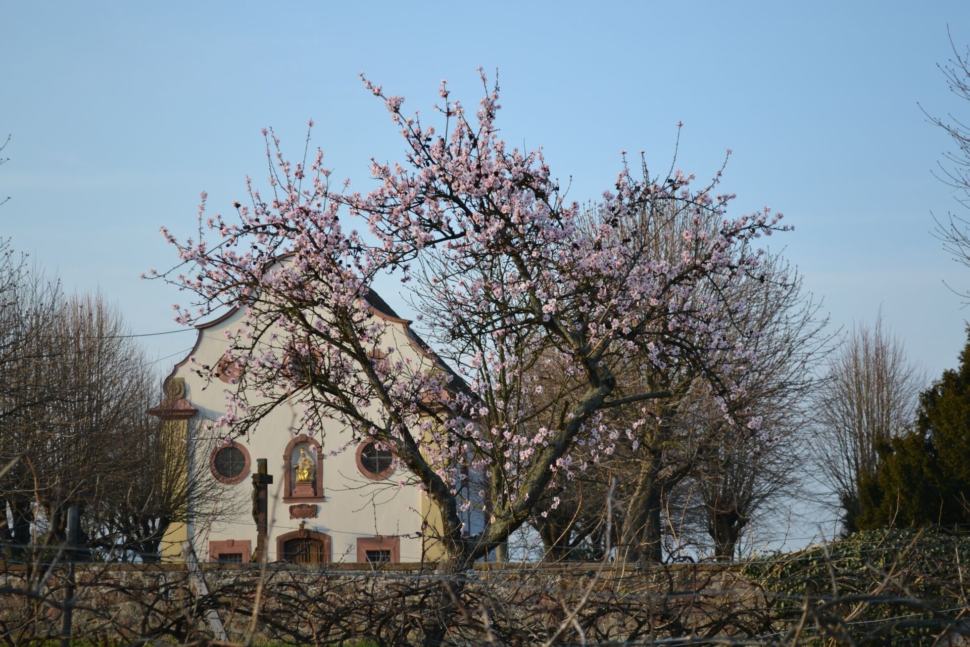 The easy circular route links the villages of Maikammer, Kirrweiler, and St Martin. In addition to the many almond trees, there are several beautiful viewpoints and picnic spots as well as historic sights/monuments. The start of the circular route is possible from two different starting points, depending on how you arrive. If arriving by train, the recommended start and end point is the Maikammer/Kirrweiler hiking station. If arriving by car, the Wanderparkplatz Alsterweiler is suitable.