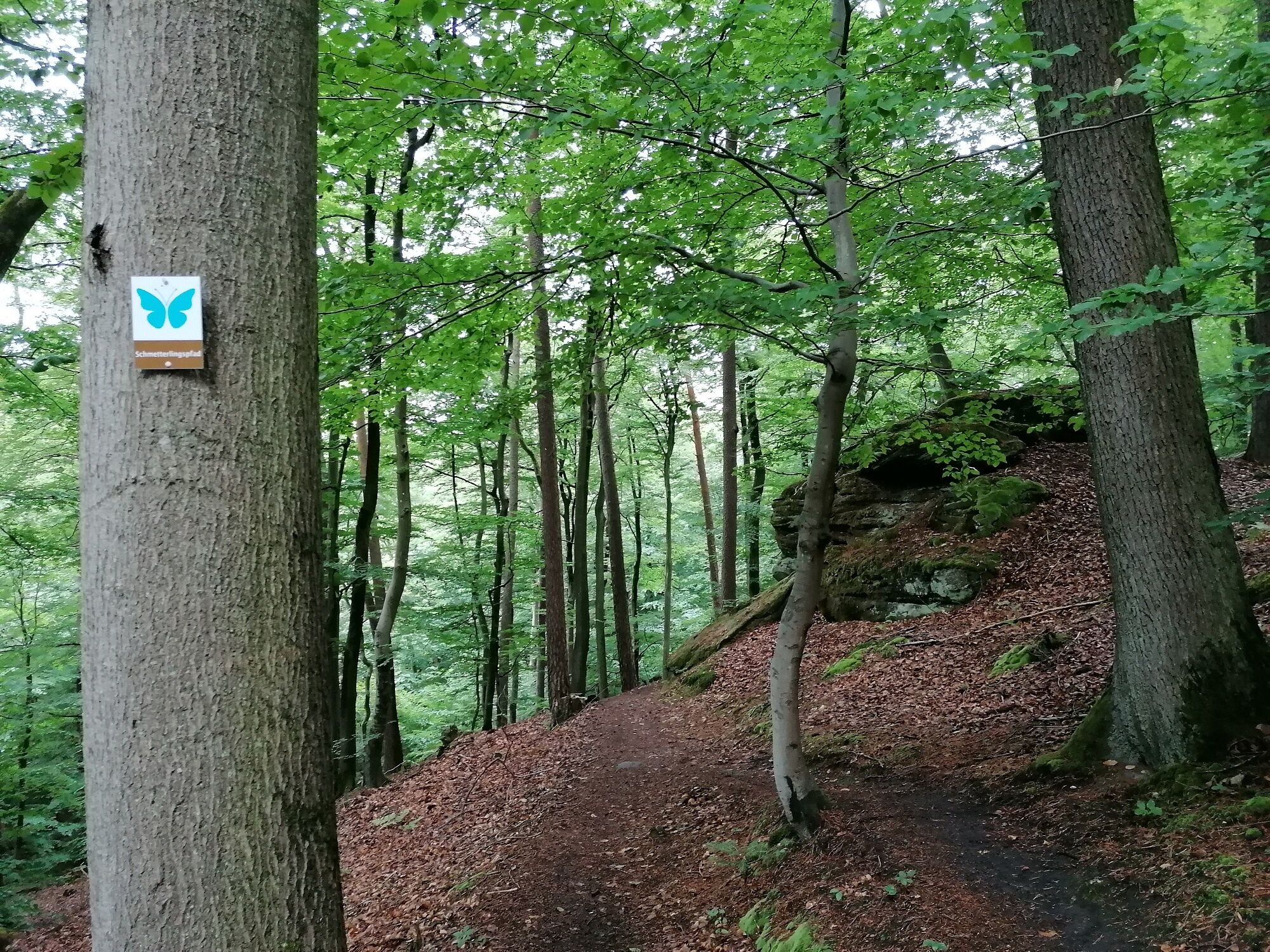 Der ca. 11 km lange Schmetterlingspfad startet durch die neue Wegeführung, am Wanderparkplatz im Taubental, in der Nähe von Homburg-Beeden. Wer den Weg im Uhrzeigersinn wandert, wird im Fuchs- und Taubental zuerst durch einen jungen Kiefernwald und wenige Kilometer weiter durch einen herrlichen, offeneren Waldabschnitt mit Buchen und Eichen sowie an alten, bizarren Felsformationen des Bundsandsteines entlang geführt. Der Schmetterlingspfad verläuft in vielen kleinen Kurven, welche an einen Flügel eines Schmetterlings erinnern – daher der Name des Weges. Über den sogenannten „Hohen Kopf“ verläuft die Tour weiterhin in einem herrlichen Waldgebiet, welches zur Kernzone des Biosphärenreservates Bliesgau gehört. Hier wird der Wald sich selbst überlassen, sodass die Tier- und Pflanzenwelt sich erholen und bewahren kann. Der Wanderweg führt auf dem Rückweg an der Gengelsbergwiese vorbei und endet nach wenigen Hundert Metern wieder an der Einstiegsstelle zum offiziellen Wanderweg. Über den asphaltierten entlang der sogenannten Sandgrube endet die Rundtour wieder am Wanderparkplatz Taubental.