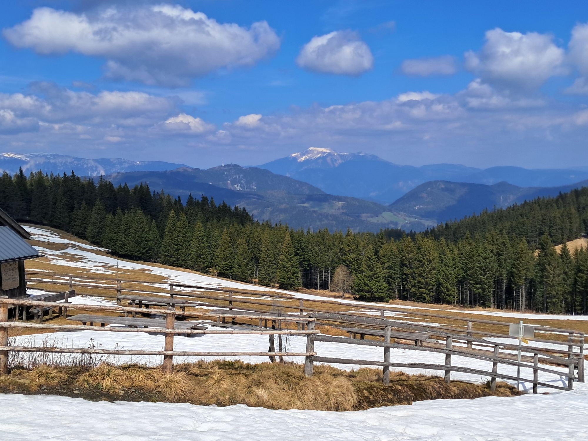 4. Tag: Die Königsetappe – vom Schutzhaus weiter kurz bergauf zum Pretulgipfel (1.656m) mit der für den 1904 ermordeten Hüttenwirt Peter Bergner errichteten Gedenkwarte. Der Weiterweg liegt nun wie auf einem Servierteller ausgebreitet vor allen Wanderern. Entlang des markanten Höhenrückens geht es über das Grazer Stuhleck und den Schwarzriegel zum höchsten Punkt der Oststeiermark, zum 1.783m hohen Stuhleck mit dem ganzjährig geöffneten Alois Güntherhaus am Gipfel (Nächtigung möglich). Von hier aus ist 1/3 des gesamten Österreichischen Staatsgebietes vom Gesäuse und den Niederen Tauern über die Steirischen Kalkalpen, das Wiener Becken, Westungarn, das Burgenland, die Oststeiermark, Teile Nordsloweniens, ja an klaren Tagen sogar der Balaton (Plattensee) zu überblicken.Sollte jedoch das Wetter hier schlecht sein, kann dieser Wegabschnitt auch recht ungemütlich werden, verläuft die Tour doch hier immer ungeschützt oberhalb der Baumgrenze.Vom Stuhleckgipfel wieder ein wenig in Richtung Südosten schwenkend führt der Weg abwärts bis zum Pfaffensattel, wo die gleichnamige Landesstraße überquert wird.Flach entlang eines Güterweges und bei einem Gedenkkreuz diesen rechts verlassend in Richtung Großer Pfaff (1.555m). Bis dieser erstiegen ist, wird Weg nun schmal und steiler.Wald und Almböden wechseln sich ab und nach dem Harterkogel (1.523) ist der Feistritzsattel bergab wandernd bald erreicht.Über die Landesstraße und gleich wieder bergauf, bei einem Wegkreuz vorbei in Richtung Rabenkopf. In einem weitläufigen Ost – Südbogen zur Bärenlacke bei der im Sommer bewirtschafteten Kranichberger Schwaig mit einem echten Weidezaunparcours. Der Weg führt nun endgültig in südlicher Richtung immer weiter leicht ansteigend über weite Almböden bis auf den Hochwechsel (1.743m, Gedenkkapelle für die letzten Kamphandlungen des 2. Weltkrieges im April 1945) mit dem fast direkt am Gipfel stehenden Wetterkoglerhaus. Nächtigung und als Tipp hier: Specklinsen gegen den Hunger und für die Zimmerkollegen!Als Abstieg vom Hochwechsel empfiehlt sich der Weg nach Mönichwald.Retour zum Ausgangspunkt am besten mit dem Taxi, öffentlich sehr umständlich!Pretul/Rosegger Schutzhaus – Stuhleck 2 Stunden,Stuhleck – Hochwechsel 5 Stunden