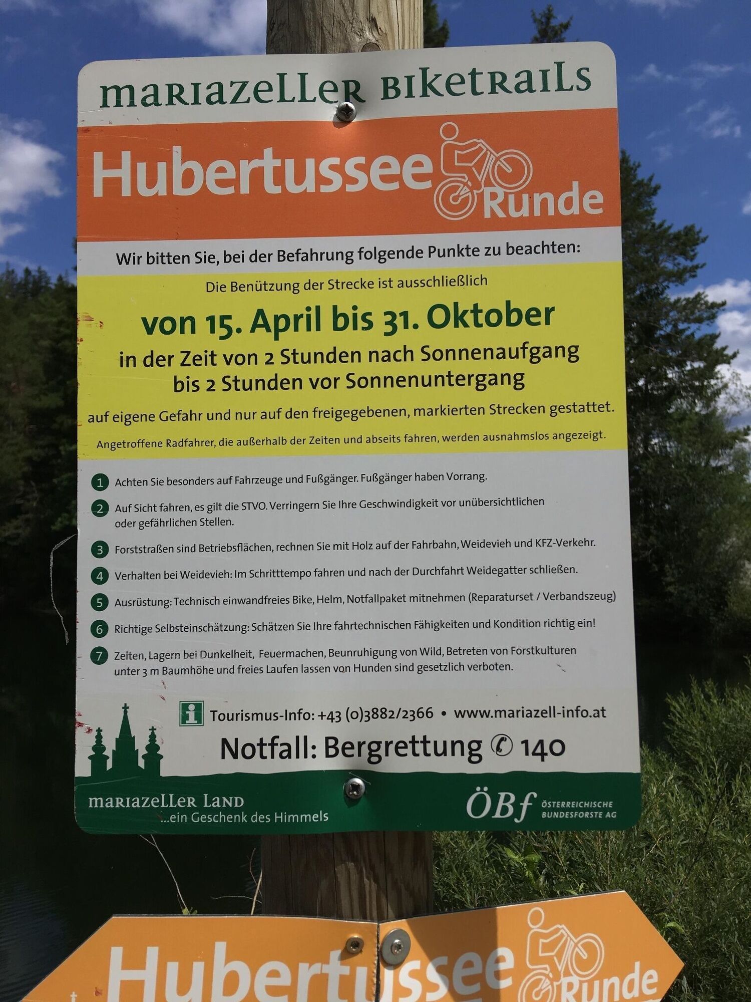 Bleibe bitte auf den vorgesehenen Wegen!Hinterlasse bitte keine Abfälle!Wanderer und Fußgänger haben Vorrang!Fahr´ bitte verantwortungsvoll und auf halbe Sicht!Fahre bitte nur ein technisch einwandfreies Bike!Ein paar Tipps für sicheres Mountainbiken: