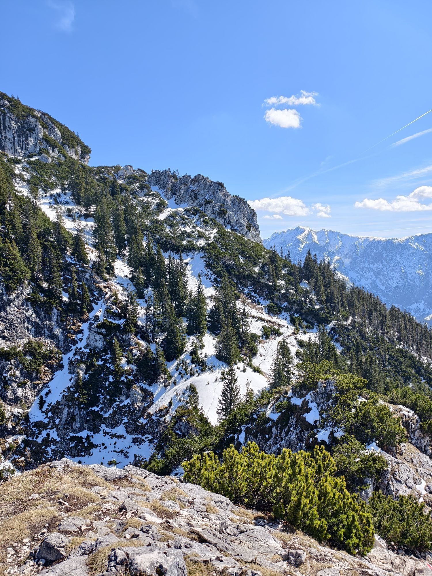 Man geht alles durch den Wald, perfekt wenn man mit Hund unterwegs ist. Es gibt ein Stelle wo man an der Wand vom Kaiser entlang gehen muss der mit einem Eisenseil gesichert ist wo man sich gut einhalten kann. Ein kurzes Stück geht man dann an der Forststraße entlang bis zur Vorderkaiserfeldenhütte, nach der Hütte geht es wieder auf den Waldpfad. Ich hab ca. von der Hütte aus noch 30 Minuten bis zur Naunspitze gebraucht, auf dem Schild steht 45 Minuten. Eine sehr schöne Tour und wenn man früh genug aufsteht dann ist man alleine auf dem Gipfel.