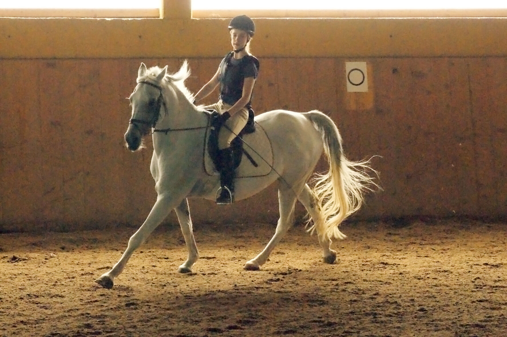 Der Reitunterricht ab 7 Jahren erfolgt vom Anfänger bis Klasse L in der Dressur. Er integriert Lehrinhalte wie Theorie, Pferdepflege, richtiger Sitz im Schritt, Trab und Galopp, Cavalettiarbeit, Springgymnastik, Longe.