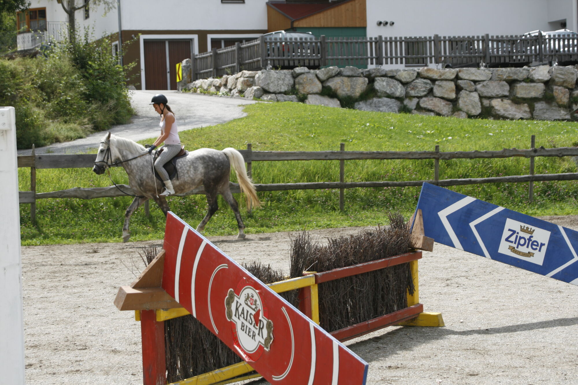 Das Reiten auf dem Außenreitplatz mit Sprungparcour ist herrlich – das ist die pure Freude für Pferdefans. Eine große Reithalle bietet Reiterfreuden bei jeder Witterung.